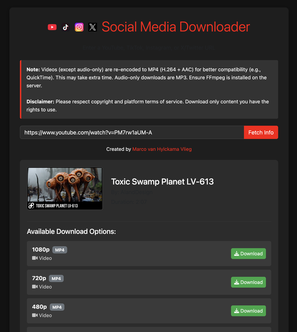 Download content from YouTube, Instagram, TikTok, Twitter, and dozens more platforms. Multiple formats and quality options, batch downloads, runs locally for privacy. Built on yt-dlp integration.